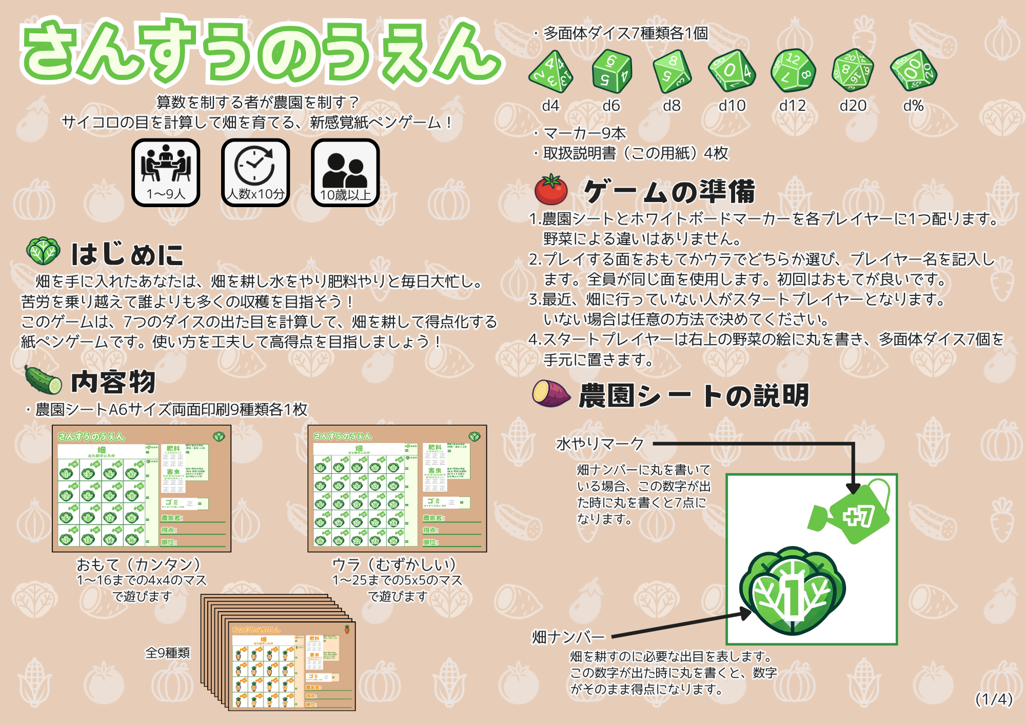 算数を制する者が農園を制す?サイコロの目を計算して畑を育てる、新感覚紙ペンゲーム! 畑を手に入れたあなたは、畑を耕し水をやり肥料やりと大忙し。苦労を乗り越えて誰よりも多くの収穫を目指そう! このゲームは、7つのサイコロの出た目を計算して、畑を耕して得点化する紙ペンゲームです。 使い方を工夫して高得点を目指しましょう!